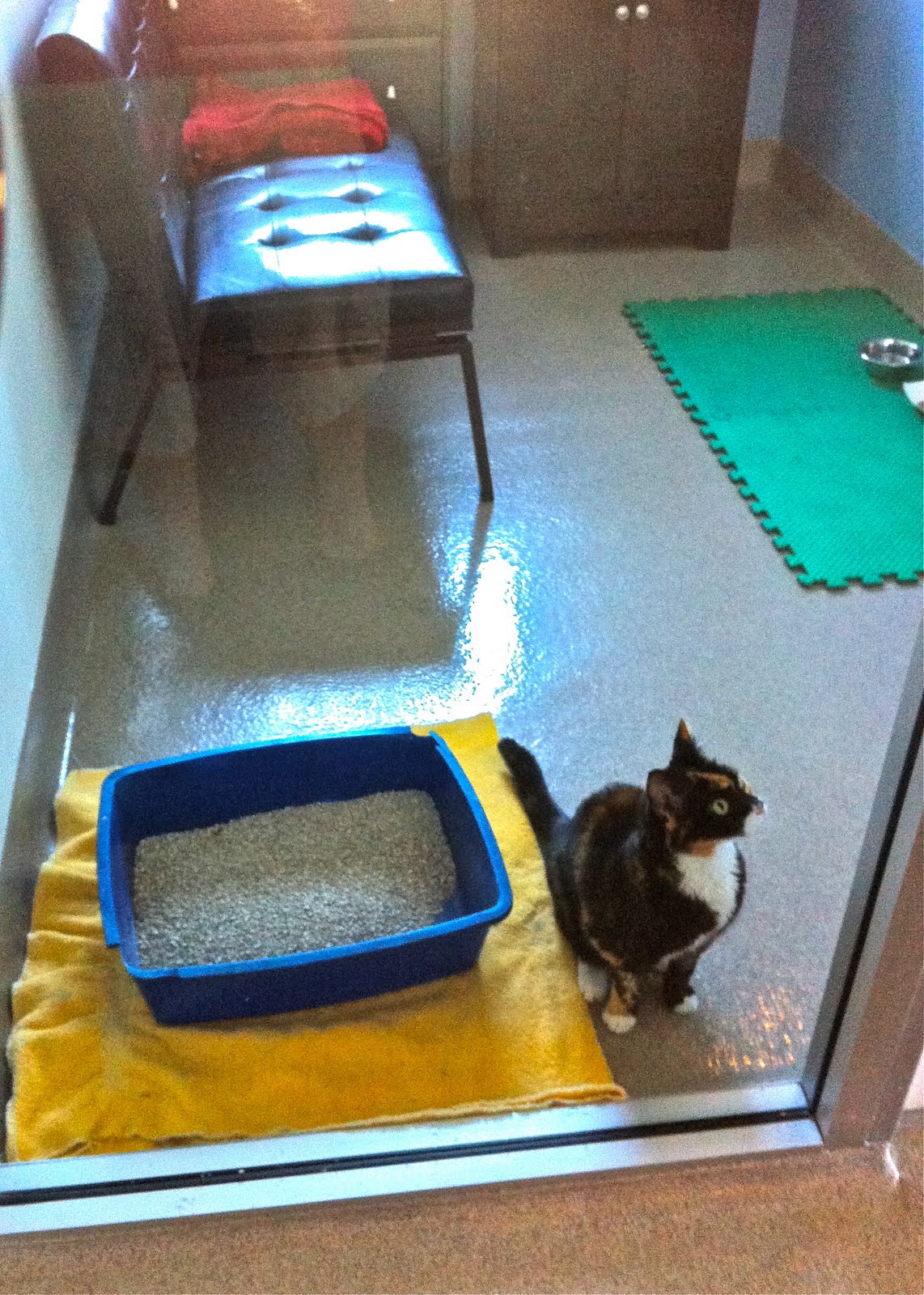 A beautiful early morning drive to the Far Continent as you call it owing to the fact that every destination in Palos Verdes is 8 miles from the freeway a painful tragedy of civil engineering flaws in the system and you end up on the bluff overlooking grand ocean cliffs and Donald Trump’s golf course with ridiculous vacant estates down below. It is here you find the lovely caretaker of animals indoor and out and she asks you in and she leads you past picture window sweeping views and into a room to a cowering little Torti under the bed.