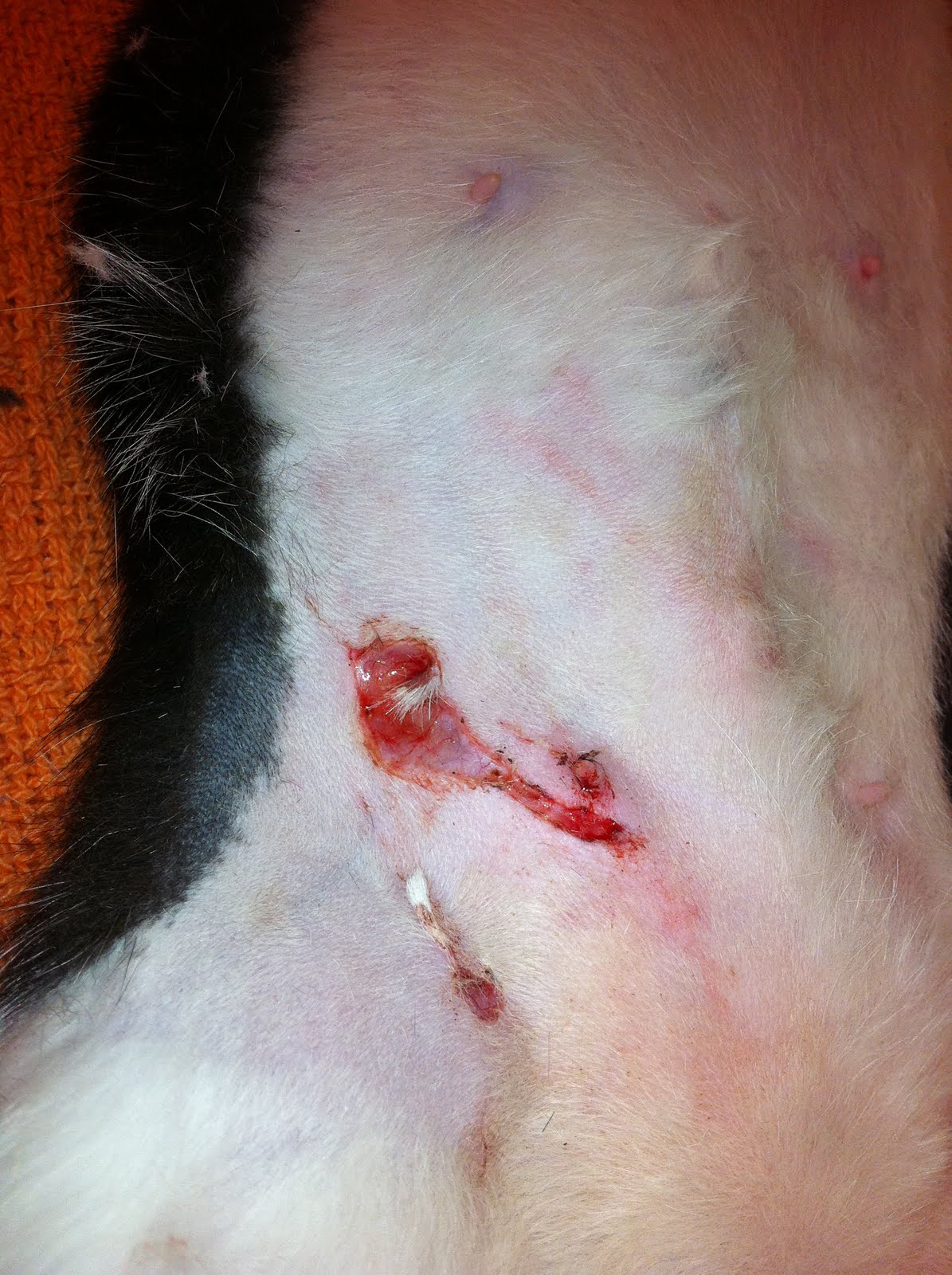 Due the severity of the injuries and multiple locations you decide it be best to bring the cat in for repairs under gas anesthesia at the clinic. Boots hangs out with you for the day and is released in the afternoon without an E-collar that you had advised. You’ve come to accept people’s personal dissent with certain veterinary standards like neutering before puberty or rejection of antibiotics or corticosteroids as well as the rejection of post-op recommendations. But fortunately Boots leaves your sutures alone. And returns to his chaperoned visits within the high-walled-in backyard with his mom and only looks longingly now and then through living room picture window overlooking the front lawn formally known as his territory.